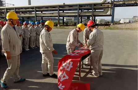隨后總經理尚繼榮帶領大家宣讀以:“我是金昱元集團一名員工,為了個人安全健康,為了家庭幸福美滿,為了公司穩步發展,我鄭重宣誓:忠誠企業,恪盡職守,關注安全,珍愛生命。我堅決做到:牢記安全第一,遵守規章制度,遵守操作規程,遵守勞動紀律,不違章,不冒險,不留隱患,不出事故。我將以實際行動,爭做安全合格員工,確保生產安全,讓企業放心”為內容的安全誓詞。最后,在尚總的帶頭下,所有參會人員在“防風險、除隱患、遏事故”的條幅上簽名,承諾自己將以的實際行動,履行好本崗位的安全職責。簡單的一個簽名不僅簽下對自己和家人的一份責任,同時也簽下對企業安全發展的一個承諾。