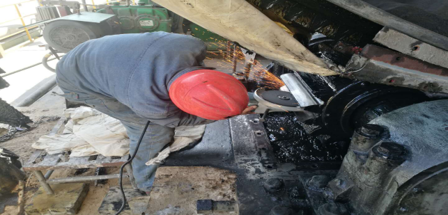 (6)烘干破減速機(jī)齒輪及軸承檢查,更換油封,聯(lián)軸器找正。破碎機(jī)內(nèi)部襯板檢查并緊固螺栓,破碎機(jī)內(nèi)雜物清理(未完成);