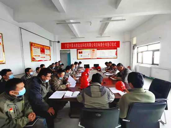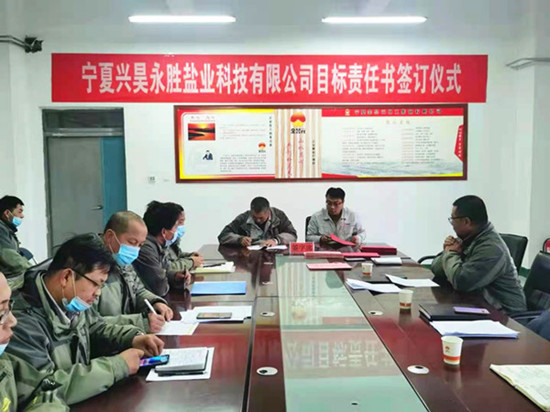 2021 年 1 月 7 日 15:30,寧夏興昊永勝鹽業科技有限公司召開了2021年首次安委會擴大會議暨安全生產目標責任書簽訂儀式。會議由公司總經理主持,公司安委會全體成員及技術員以上人員參加了本次會議。
