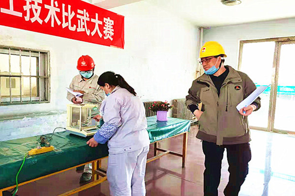 比賽現場女職工熟練的操作技能,沉著冷靜,對電石破碎樣品進行計量稱重;對工作一絲不茍,嚴格把控電石發氣量。