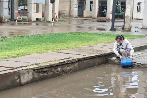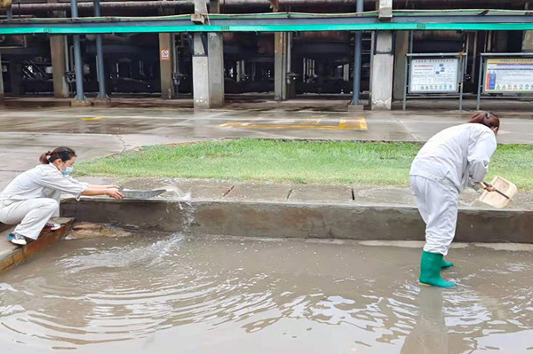 無論刮風還是下雨,天氣有多惡劣 ,總有一群人,她們始終是堅守在崗位一線的最美員工,那就是從事質檢分析的女工們。其實在四班三倒的日子里,她們最頭疼的不是工作忙,而是遇見雨雪天氣,特別是下雨天時,出門去現場取樣就變得困難了很多,有時候為了取樣方便,她們寧愿選擇不打傘、不穿雨衣,一趟下來,衣服和鞋子差不多全濕透了。這不,那一晚她們就迎來了一夜的雨,從小雨逐漸變成中雨,聽著外面的雨聲,她們如坐針氈,萬一變成暴雨可怎么辦,雨一直不停又怎么辦,外面的雨已經越下越大,但到了取樣時間她們不畏困難做好防護準時到現場取樣,她們堅信遇到再大困難也要戰勝困難,去完成自己的工作。終于等到了天亮,雨也停了下來,等待她們的就是清理積水。看著那么一大片積水,沒有抽水泵,這讓她們犯起了難,思考了片刻,她們決定用最老土的辦法使用水桶、笤帚、簸箕清理積水,說干就干,水比較深,只好換上了雨鞋,大家分工明確,掃地掃,鏟地鏟,提得提,倒得倒,一會的功夫積水已經少了很多,在大家緊密的配合下,最終把坑里積水全部清理了出去。