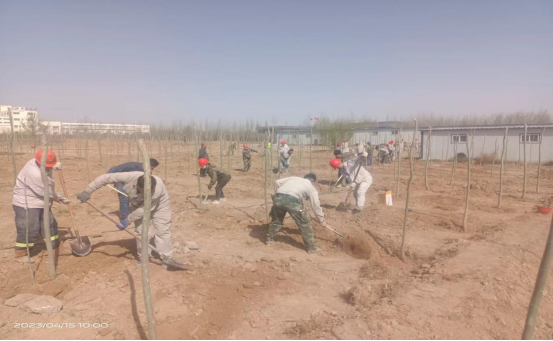 公司每年的春季都會制定本年度的環保節能目標,對廠區內的綠化設施進行完善,加大綠化面積,組織一年一度的植樹活動。由于公司主要是生產建筑材料的,以普通硅酸鹽水泥和水泥原材料熟料為主的化工企業,必不可少的廠區硬化占到了一定的面積,導致綠化覆蓋率較少。但是就是這樣的條件下,公司領導還是在有限的廠區綠化面積里盡可能的多種樹,改善員工的工作生產環境,保護環境衛生。公司領導組織員工在原料堆廠的邊上再種一排楊樹,由于原料廠邊上常年受運輸車輛的碾壓,地質堅硬,鐵鍬等普通挖土工具挖土困難,導致種樹進度緩慢。于是公司領導就協調安排了挖掘機進行挖樹坑,挖好了樹坑,就安排各裝置對于各自區域的樹苗進行移栽,經過大家的齊心協力,樹苗都被小心翼翼的放到了新挖的樹坑里,你扶樹苗,我埋土,好不熱鬧,在大家共同努力下一排整齊的樹苗矗立在原料堆場的邊上。守護著這邊我們為之奮斗的熱土。