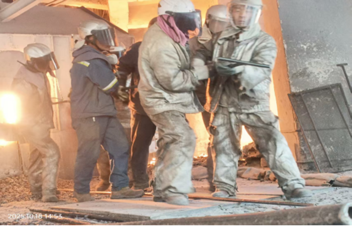 出爐工,是這里的主角。他們身著被汗水反復浸透又烤干、結(jié)出白色鹽漬的阻燃服,頭戴沉重的防護頭盔,像無畏的戰(zhàn)士,堅守在陣地的最前沿。他們的工作,是時刻關(guān)注爐況,用長長的鋼釬疏通投料口,防止“棚料”。每一釬下去,都需要全身的力氣,與爐內(nèi)黏稠的料漿抗爭。汗水從額頭滾落,迷住雙眼,卻來不及擦拭,因為爐火不等人。