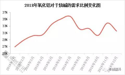 根據卓創監測,2018年氧化鋁對于燒堿的需求占比達到33%-34%,如上圖所示,2018年大多數月份氧化鋁行業對燒堿需求比例均超過30%,其中個別月份最高需求占比達到35.81%左右,最少的月份需求占比也在27%左右。毫無疑問,氧化鋁是目前燒堿下游需求行業中的“頂梁柱”般的存在,對燒堿市場起到明顯剛性需求支撐,是燒堿行業最值得信賴的需求點。