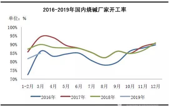 2019年國內燒堿市場走勢與歷年行情走勢相比較為反常,2019年春節后燒堿價格持續走低。以99%片堿為例,從2019年2月中旬至4月17日,國內均價從4040元/噸跌至3040元/噸,下跌1000元,跌幅高達25%。供應過剩是燒堿價格持續下跌的主要原因。自2018年10月以來,國內燒堿廠家開工率始終維持在80%以上的高位,高峰時甚至達到九成以上。與此同時,下游特別是氧化鋁市場開始發生逆轉,鋁價下跌導致行業陷入虧損,氧化鋁廠家開工紛紛下調。作為重要的下游行業,氧化鋁需求欠佳直接重挫燒堿行情。供大于求的情況下,燒堿社會庫存直線上漲,市場價格快速下滑。