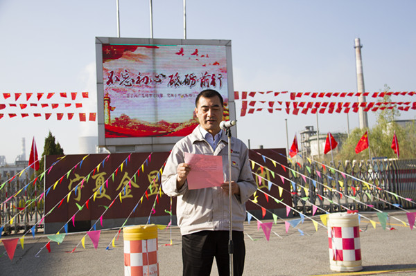 升國(guó)旗儀式伊始,集團(tuán)公司黨委副書記王立軍,集團(tuán)公司副總裁、青銅峽片區(qū)總經(jīng)理尚興向升國(guó)旗儀式致辭。