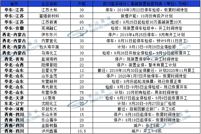 進入9月份我國氯堿裝置開工情況較為平穩,氯堿檢修企業較少,開工率維持在78%-81%之間。截止9月10日,中國氯堿裝置具體檢修情況如下圖: