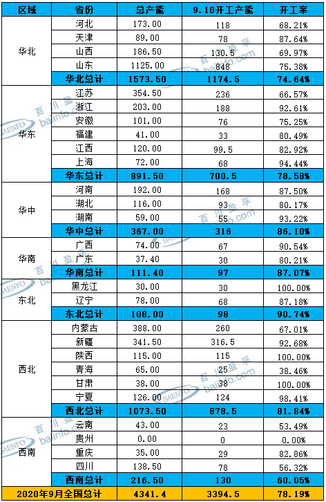 2020年9月份涉及檢修的廠家較少,整體開工變化不大,主要因山東、新疆、內蒙、河北等氯堿大省氯堿企業基本上半年完成檢修工作。
