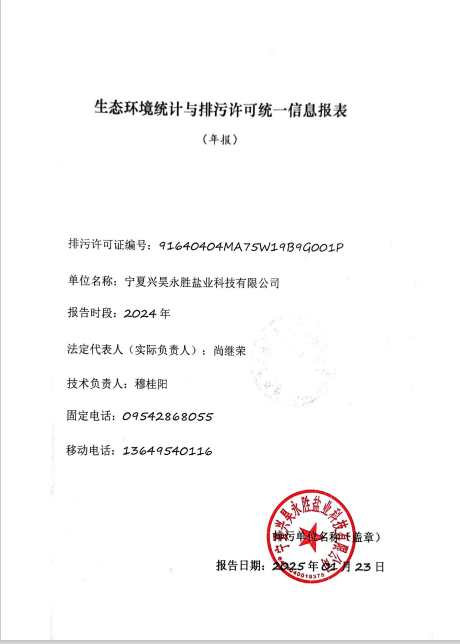 寧夏興昊永勝鹽業科技有限公司2024年排污許可執行報告
